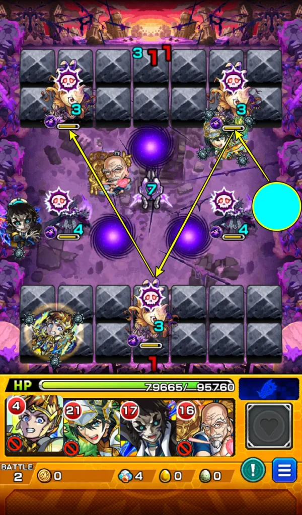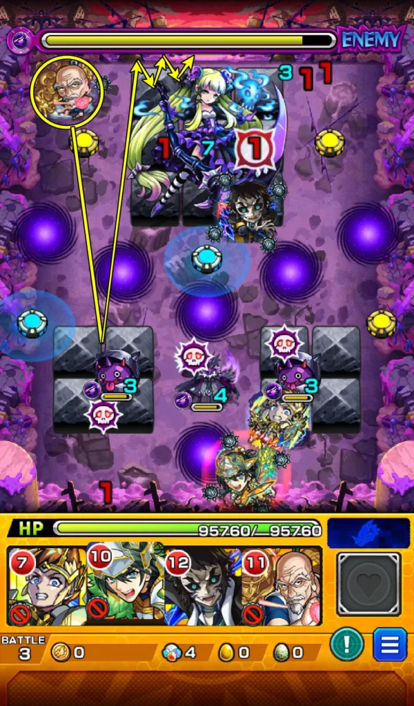 このステージのポイントは、味方のキャラがグローボム赤色に重なっているとき、玉葱3体を処理することが可能です。