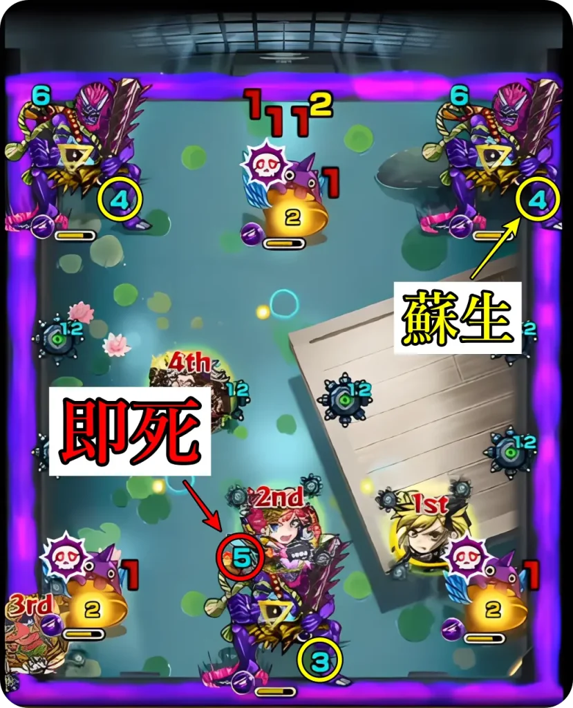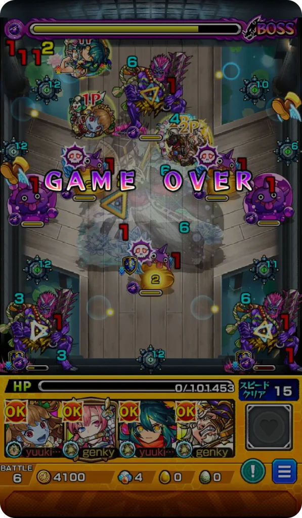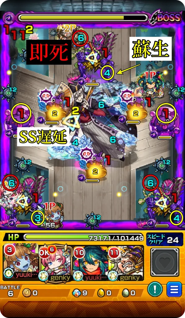 ここでは、鬼が登場し、右下の数字で敵を全て蘇生してきます。