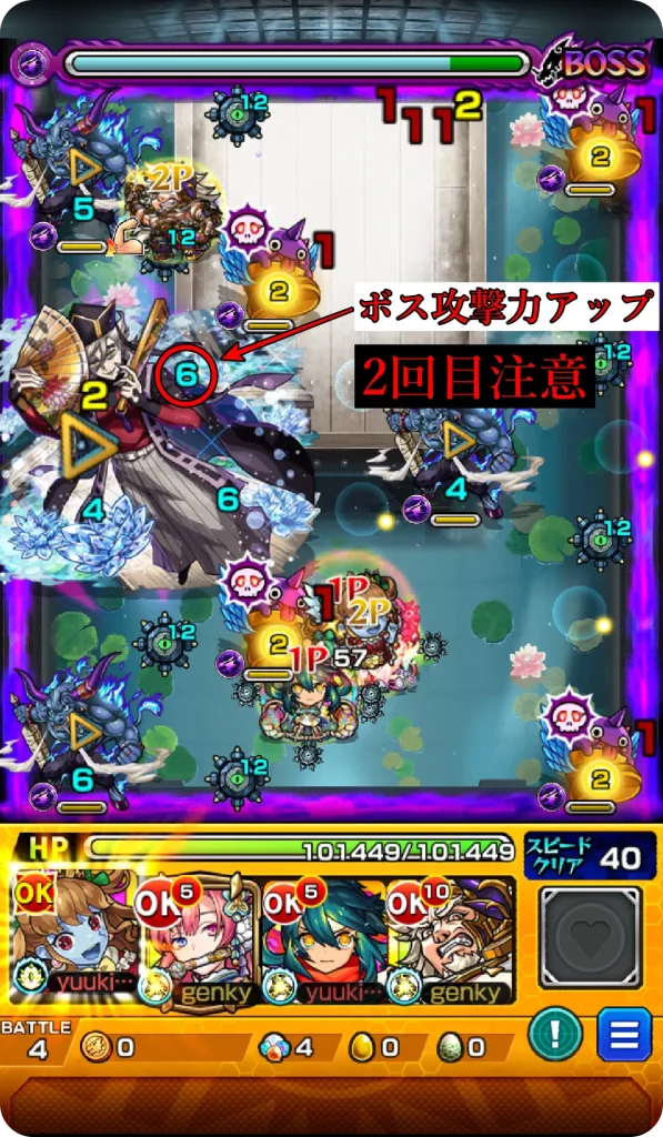ボスの右上の攻撃は攻撃力アップで、2回目以降は耐えられません。