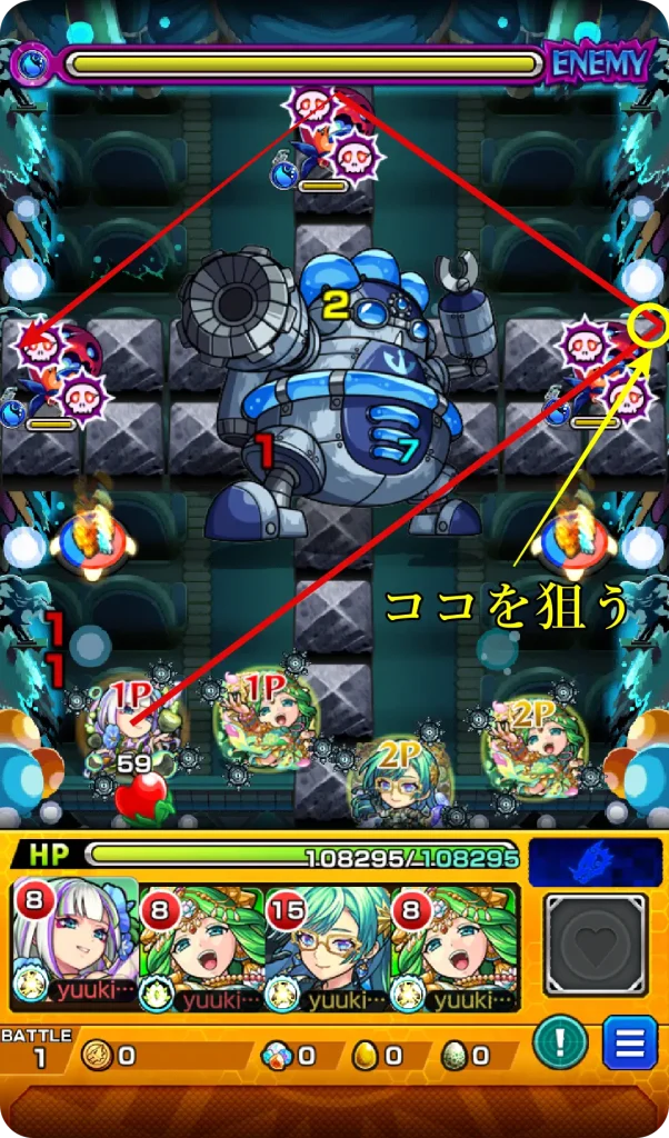- バルーンを1体処理し、上のロボの弱点を出現させる