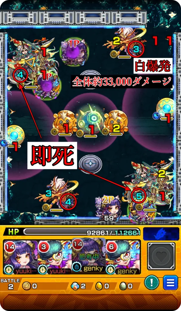 右下の数字で白爆発(全体約33000ダメージ)を放ってきます。